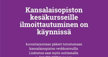 Ilmoittautuminen kansalaisopiston kesäkursseille on käynnissä ja ilmoittautuminen on alkanut vilkkaa...