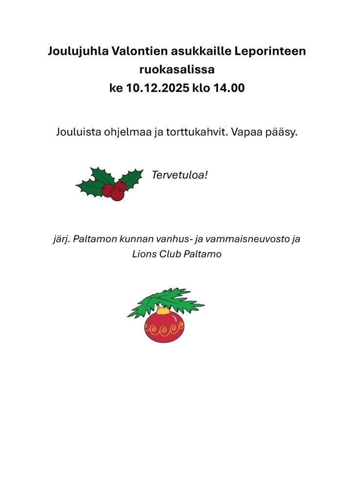 Joulujuhla Leporinteen ruokasalissa ke 10.12.2025 kello 14