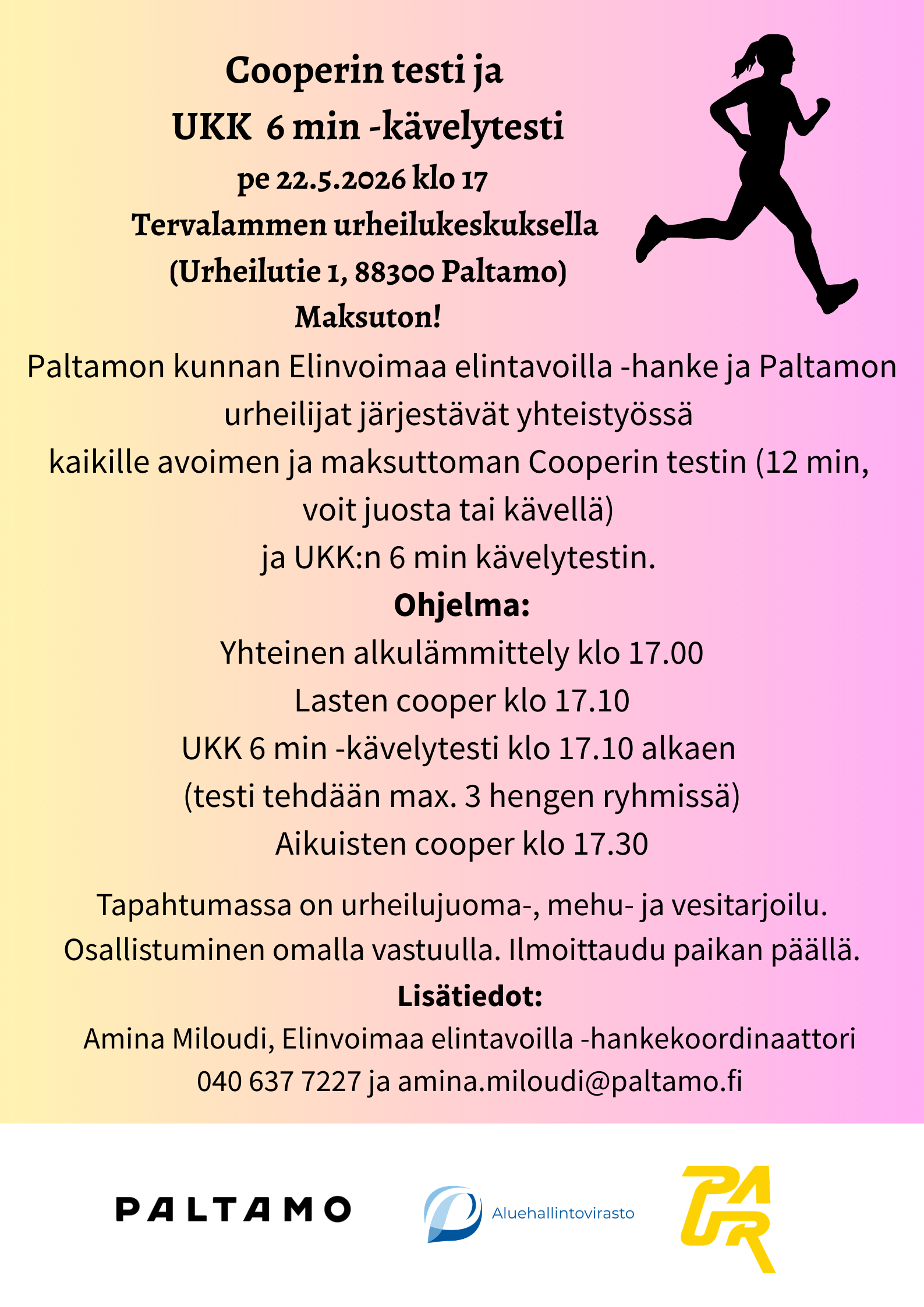 Cooper ja UKK6min kävelytesti järjestetään Paltamossa pe 22.5.2026. Tervetuloa mukaan! Lisätietoja löydät täältä.