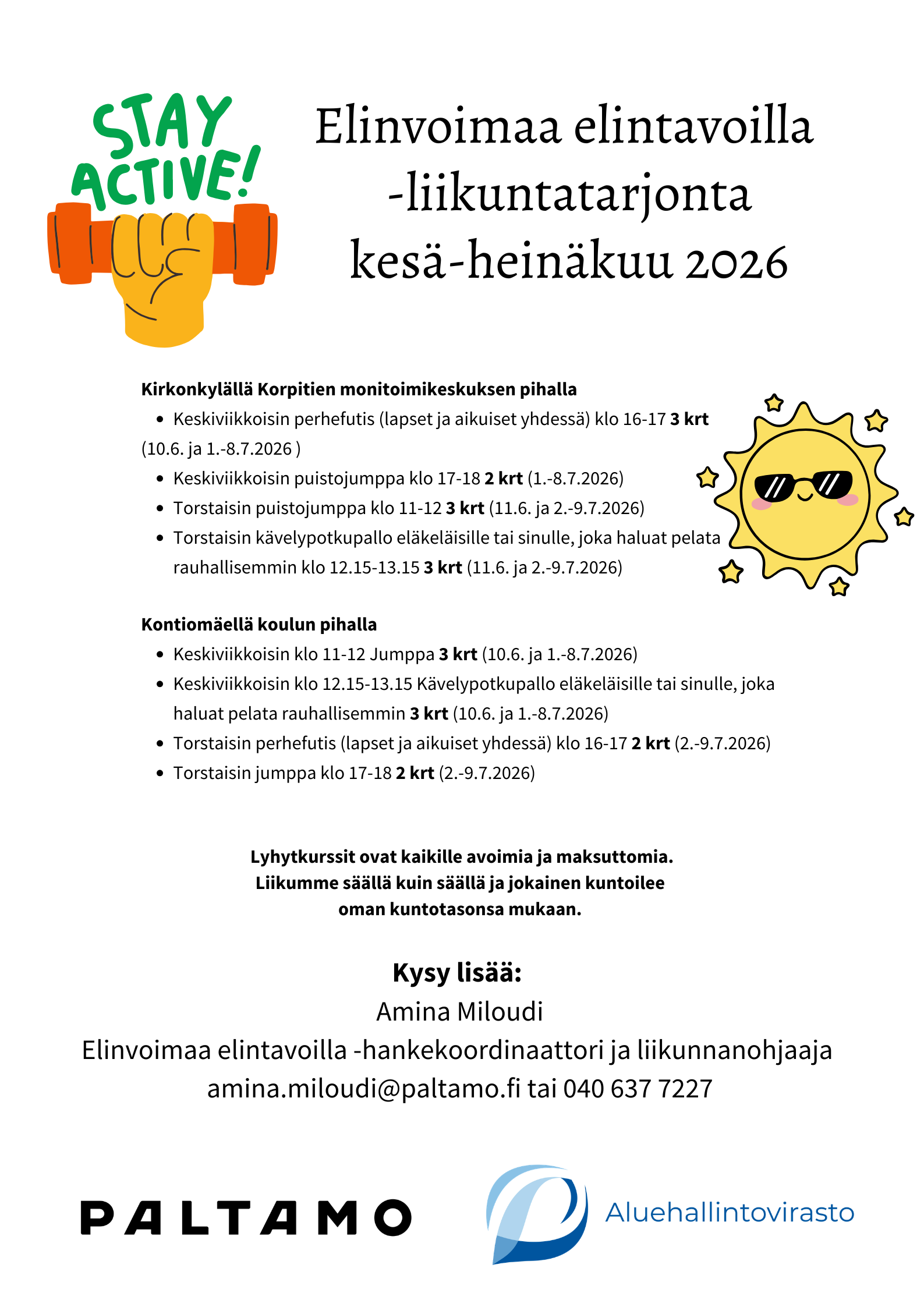 Kesä-heinäkuun liikuntatarjonnan löydät täältä. Huomioi, että liikuntatarjontaa on kesäkuussa yhdellä viikolla ja heinäkuussa kahdella viikolla.