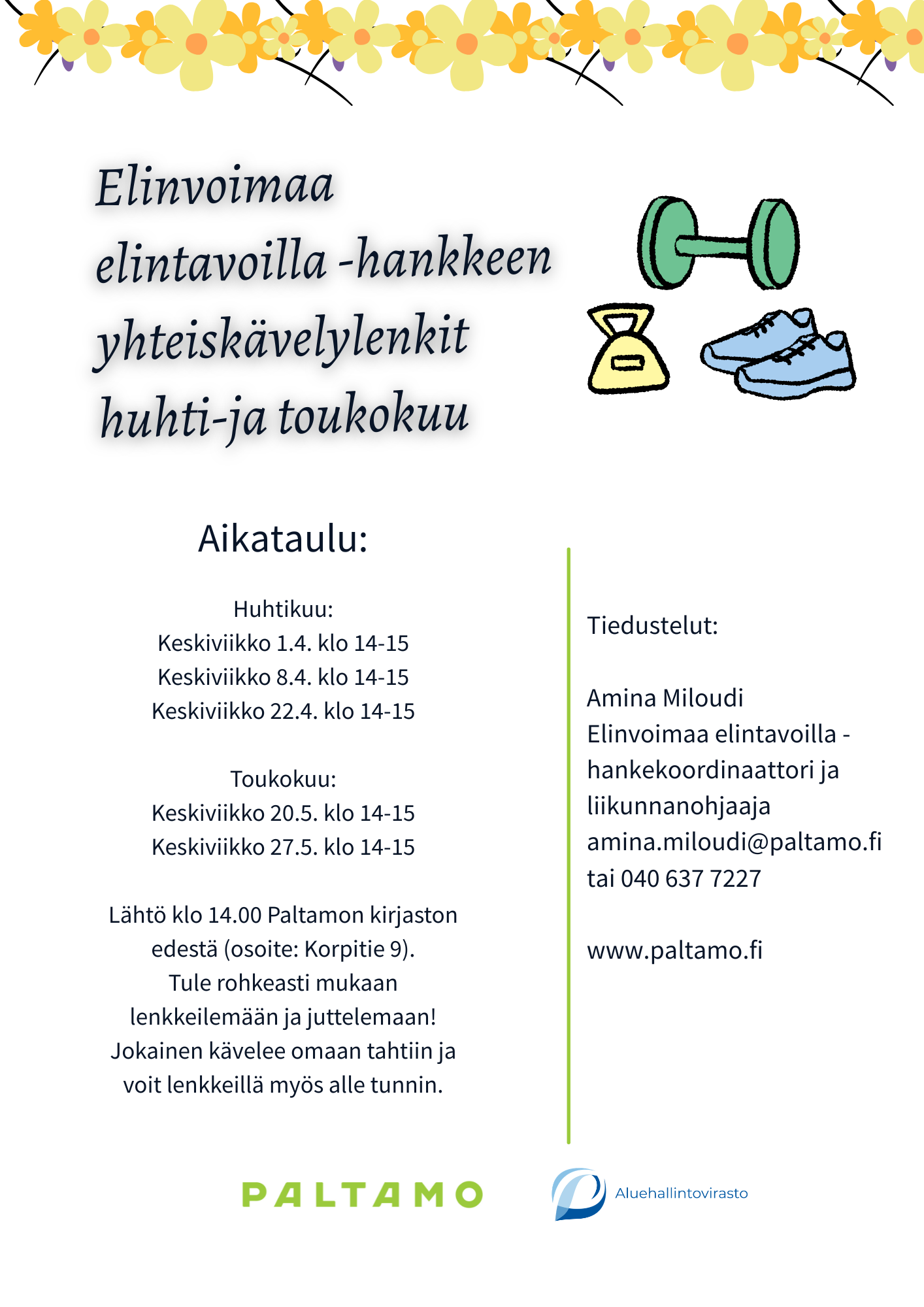 Huhti-toukokuussa järjestetään yhteiskävelylenkkejä. Aikataulun löydät täältä.